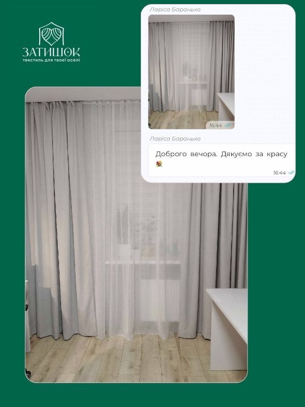 Готовий набір складається з 2-хштор на універсальній тасьмі шириною 6 см, що має два ряди петель. Цей комплект виконаний з тканини середньої щільності-мікровелюр, що дозволяє добре захищати від прямих сонячних променів.